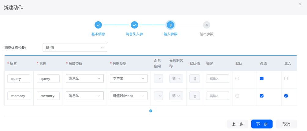 步骤 5 输入参数: 第一行query,query,消息体,字符串,必填。第二行memory,memory,消息体,键值对,必填,集合。点击下一步