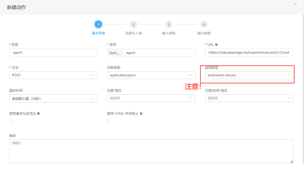 步骤 3 输入标签和名称,URL为步骤4中获取的api地址,方法选择post,内容类型选择application/json,返回类型选择text/event-stream超时时间可自定义,点击下一步。