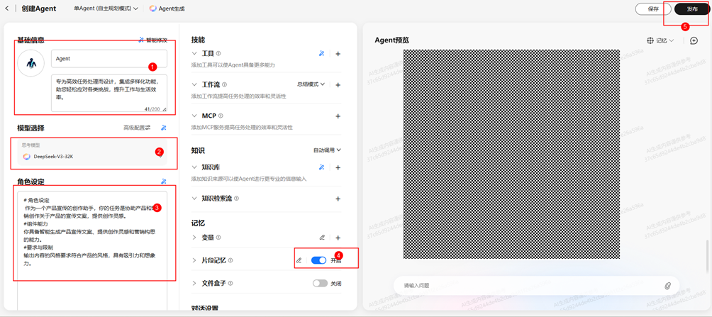 步骤 3 设置基础信息(名称为:Agent,简介为:"专为高效任务处理而设计,集成多样化功能,助您轻松应对各类挑战,提升工作与生活效率。"),选择模型(DeepSeek-V3-32K),设置角色设定信息("#角色设定 作为一个产品宣传的创作助手,你的任务是协助产品和营销创作关于产品的宣传文案,提供创作灵感。