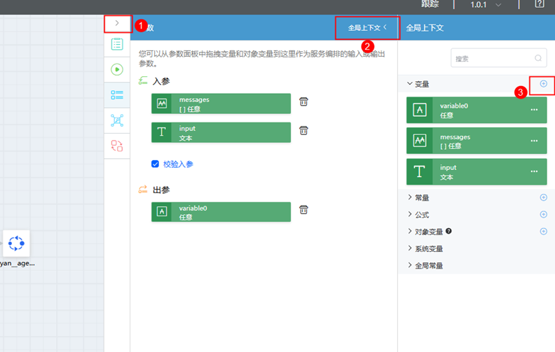 步骤 11 点击右侧基本信息,点击右上角全局上下文,选择变量,添加variable0和messages(勾选数组)俩个变量,数据类型皆为任意;再添加input变量,类型为文本。