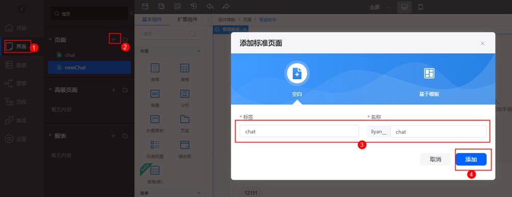 步骤 1 在应用左侧导航栏,点击界面,找到页面栏+号,创建页面,设置标签名称(可自定义)。