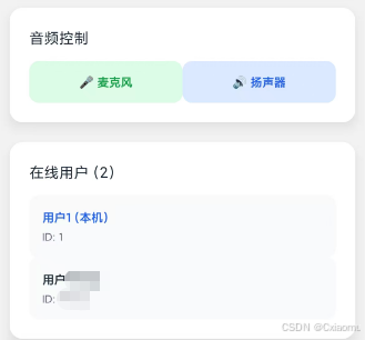 user_001),点击"获取权限"→"加入房间"; - 第二台手机重复上述操作,填入相同房间号即可互通;