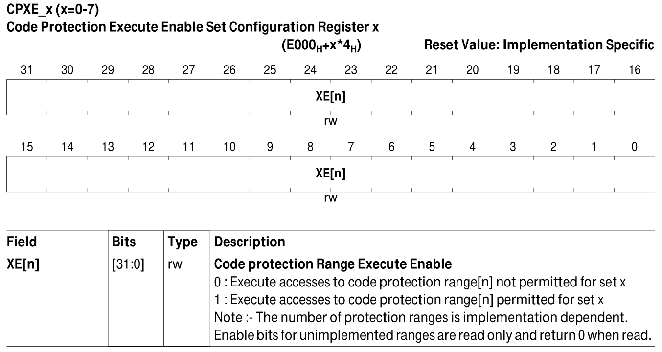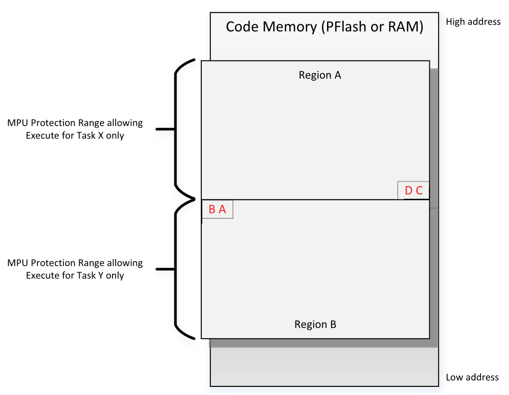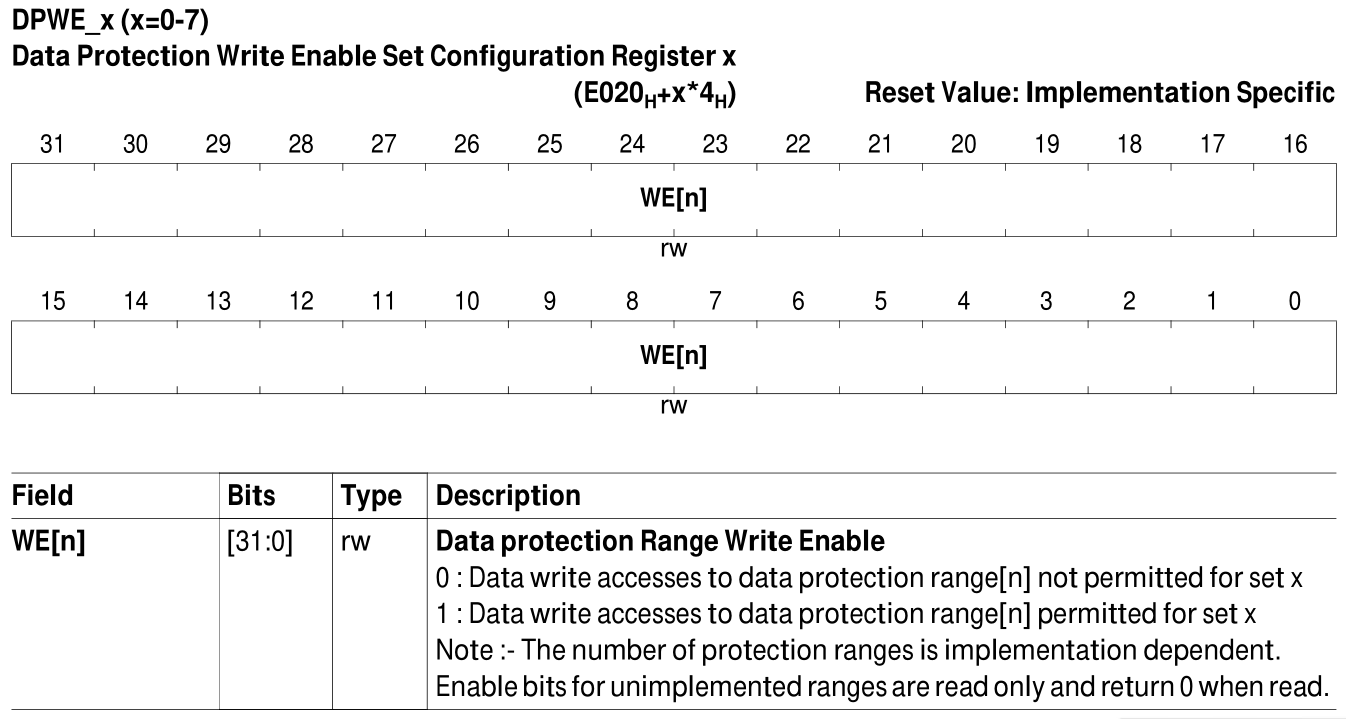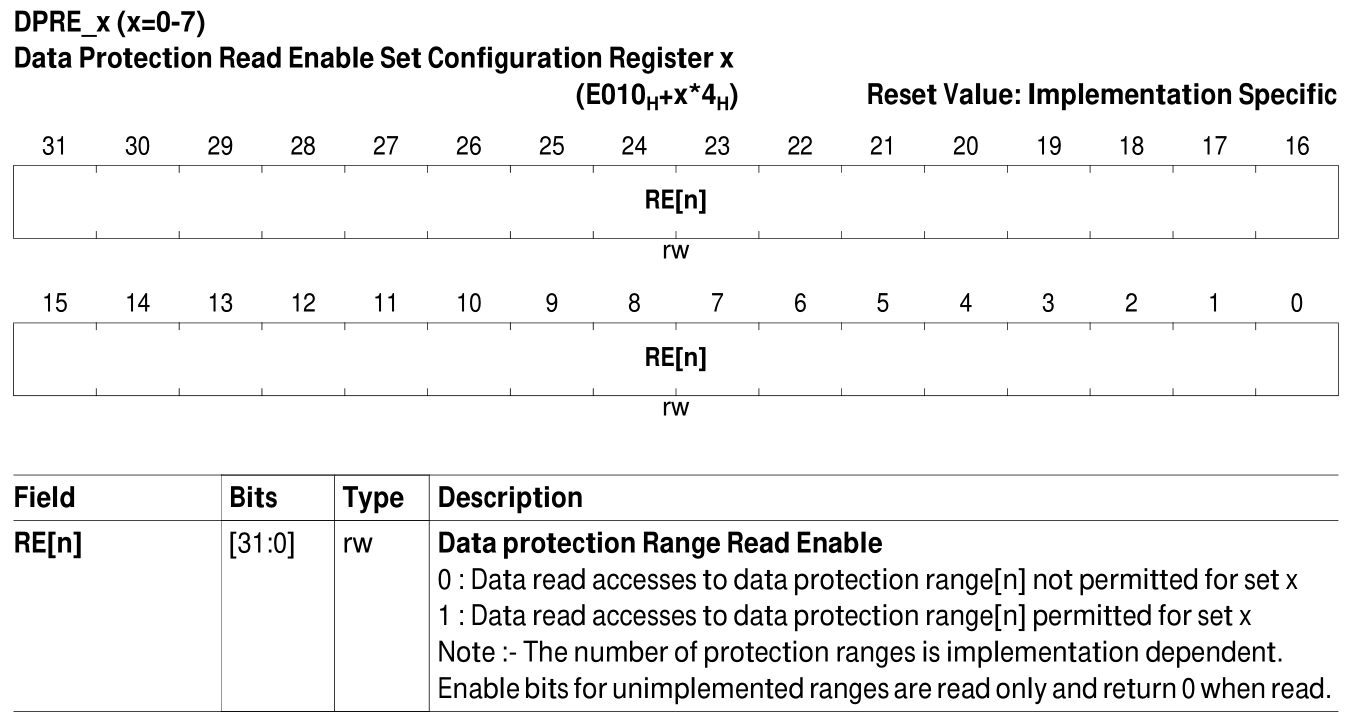 在一个保护集中,每个数据保护范围都有相关的读使能和写使能标志。每个代码保护范围都有一个相关的执行使能标志。