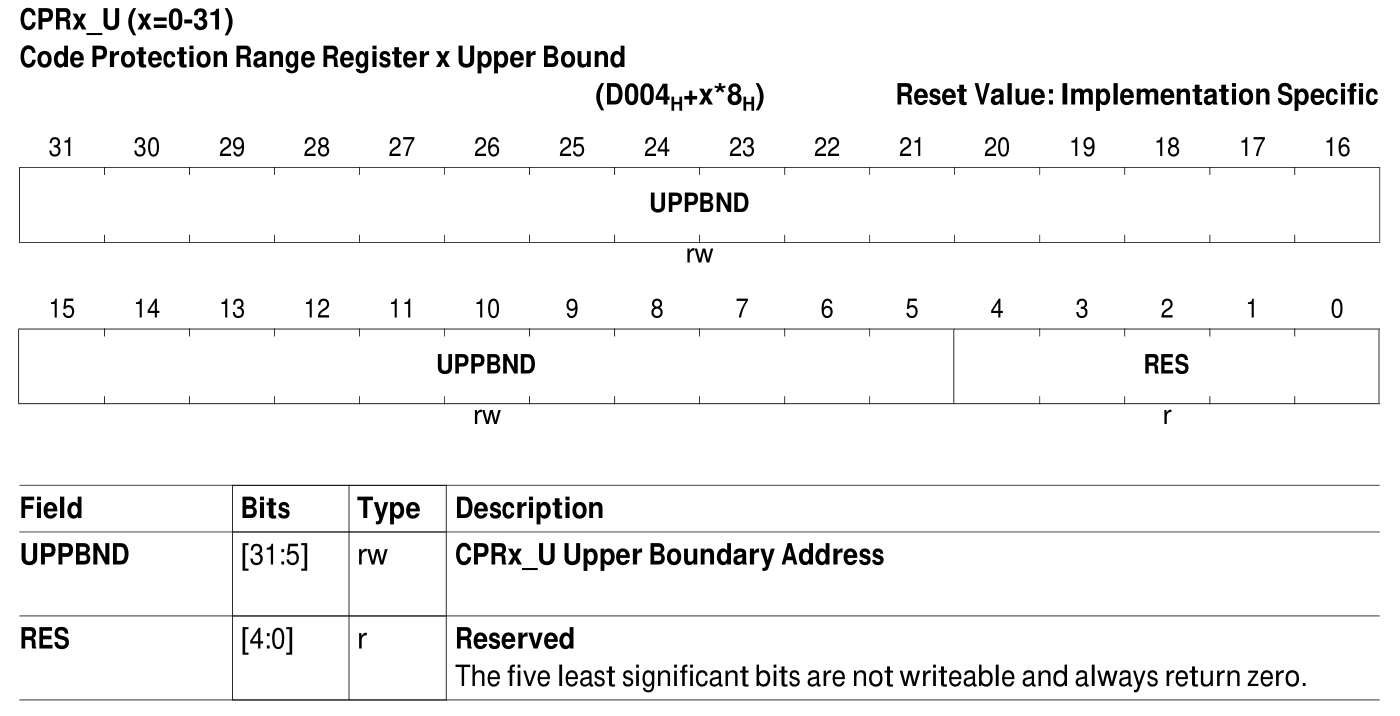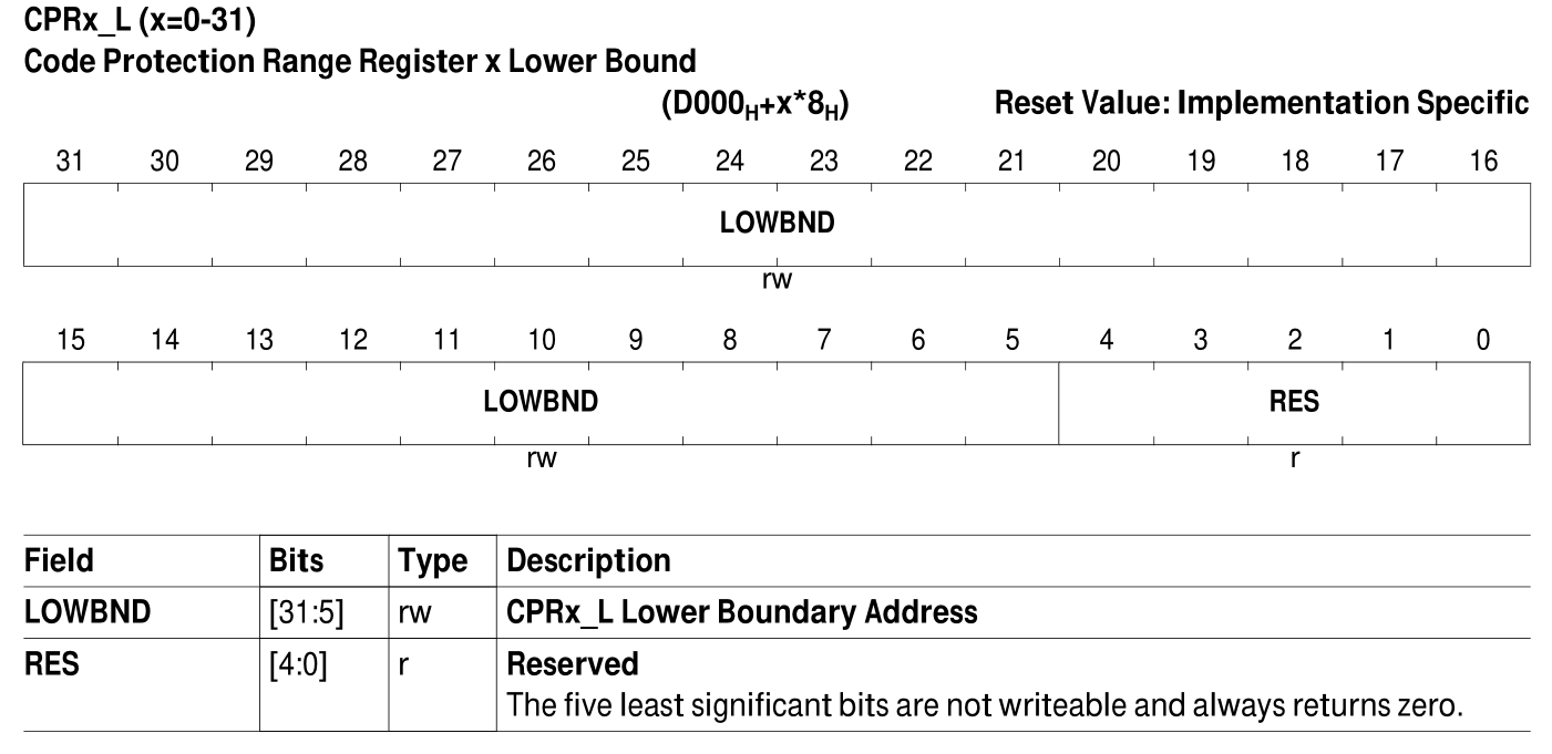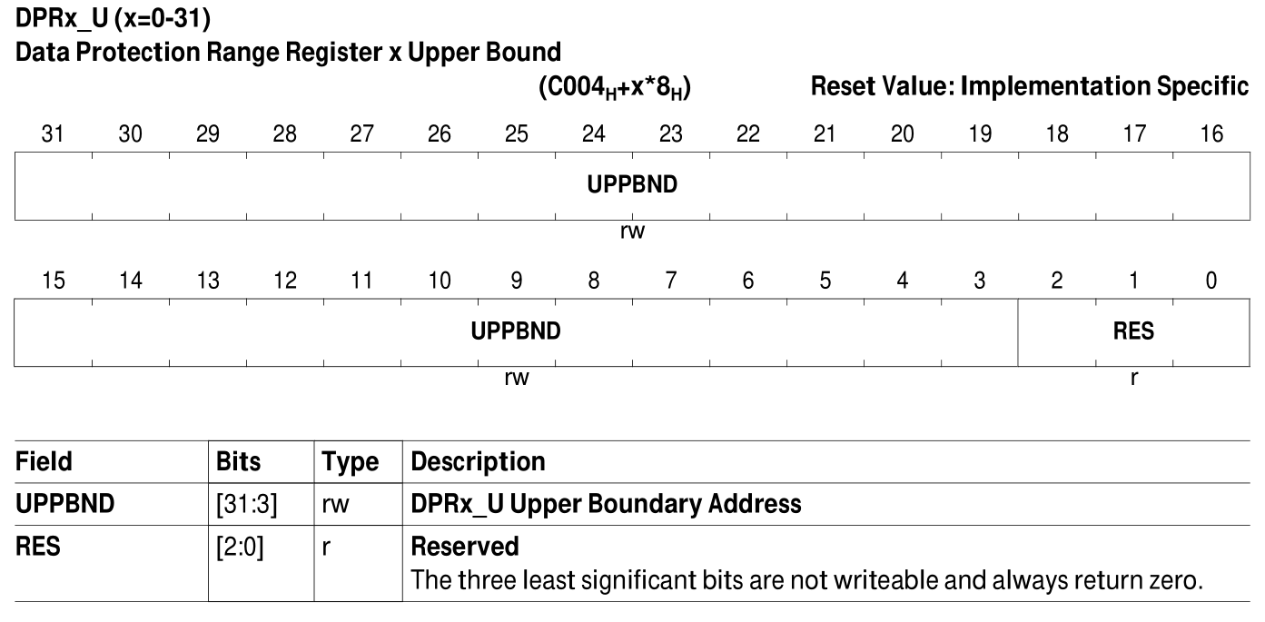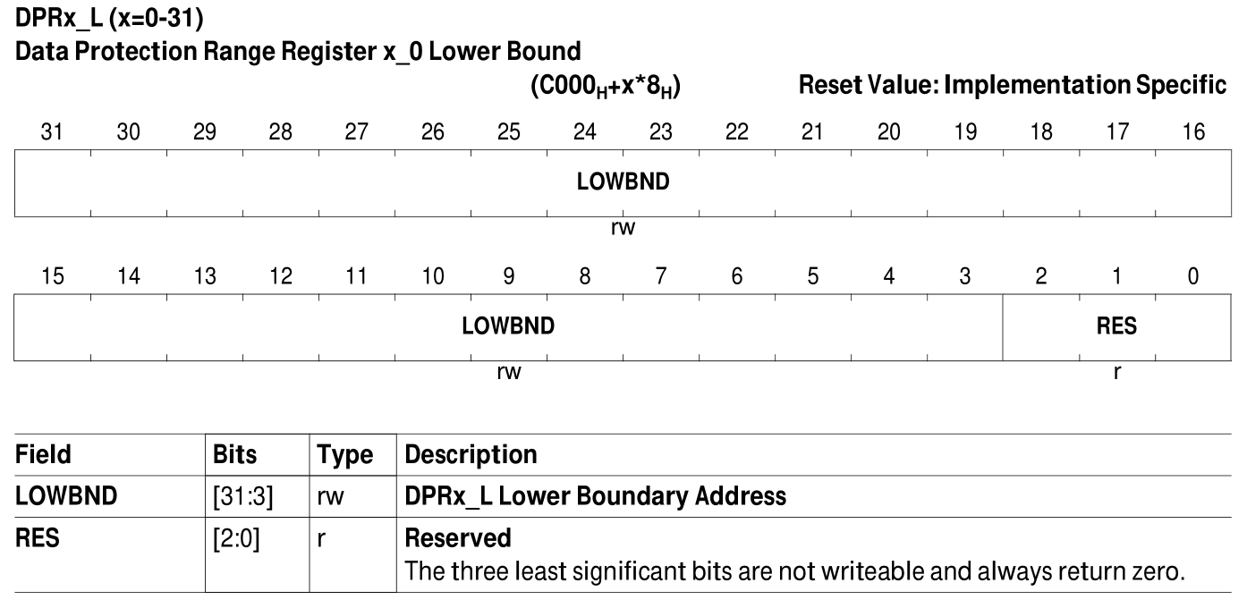 当保护功能启用时,TC1.6.2P 会根据已启用的 MPU 保护范围来检查指令获取和数据访问操作的基地址。如果该基地址不在已启用的保护范围内,将引发陷阱。TC1.6.2P 不会检查指令获取或数据访问的完整范围。因此,一条从一个已启用区域最顶部开始的指令获取或数据访问,可能会延伸到非启用区域,而不会触发陷阱条件。