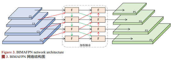 (2) 在颈部构建双向多分支辅助特征金字塔网络(Bi-directional Multi-branch Auxiliary Feature Pyramid Network, BIMAFPN),实现多路径跨层与双向融合,强化浅层细节与高层语义的协同表征,提升复杂背景下的可分离性与鲁棒性;