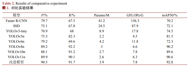 为全面衡量模型的检测性能与计算代价,本文选取精准率(Precision, P )、召回率(Recall, R)、平均精度(mAP)、参数量(Params)和GFLOPs五项指标。