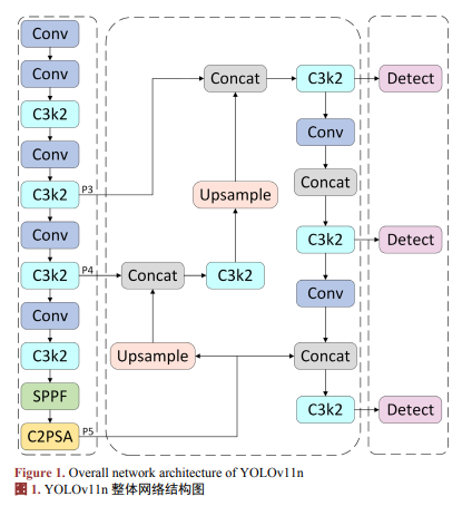 YOLOv11n的网络架构如图1所示,由骨干网络、颈部网络、检测头三部分组成。