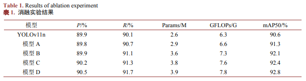 为直观评估各改进环节的贡献,按"P2 → BIMAFPN → NWD-Inner-MPDIoU → DyHead"的顺序逐步叠加,构建模型A、B、C、D,与基线YOLOv11n在相同设置下对比,结果如表1所示。