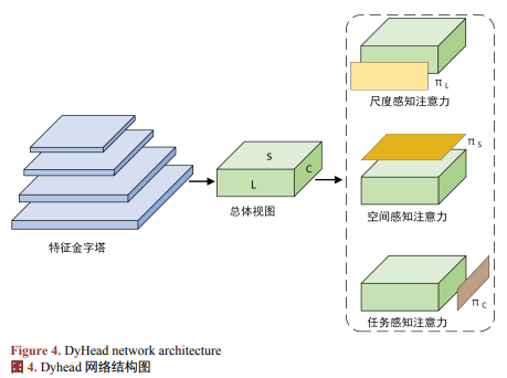 为应对红外无人机目标在低对比、尺度跨度大及轻微位移等条件下,检测头阶段易出现的"尺度选择不准、空间错位与通道利用不足"问题,本文在颈部输出之后引入动态注意力检测头DyHead。其整体结构如图4所示。