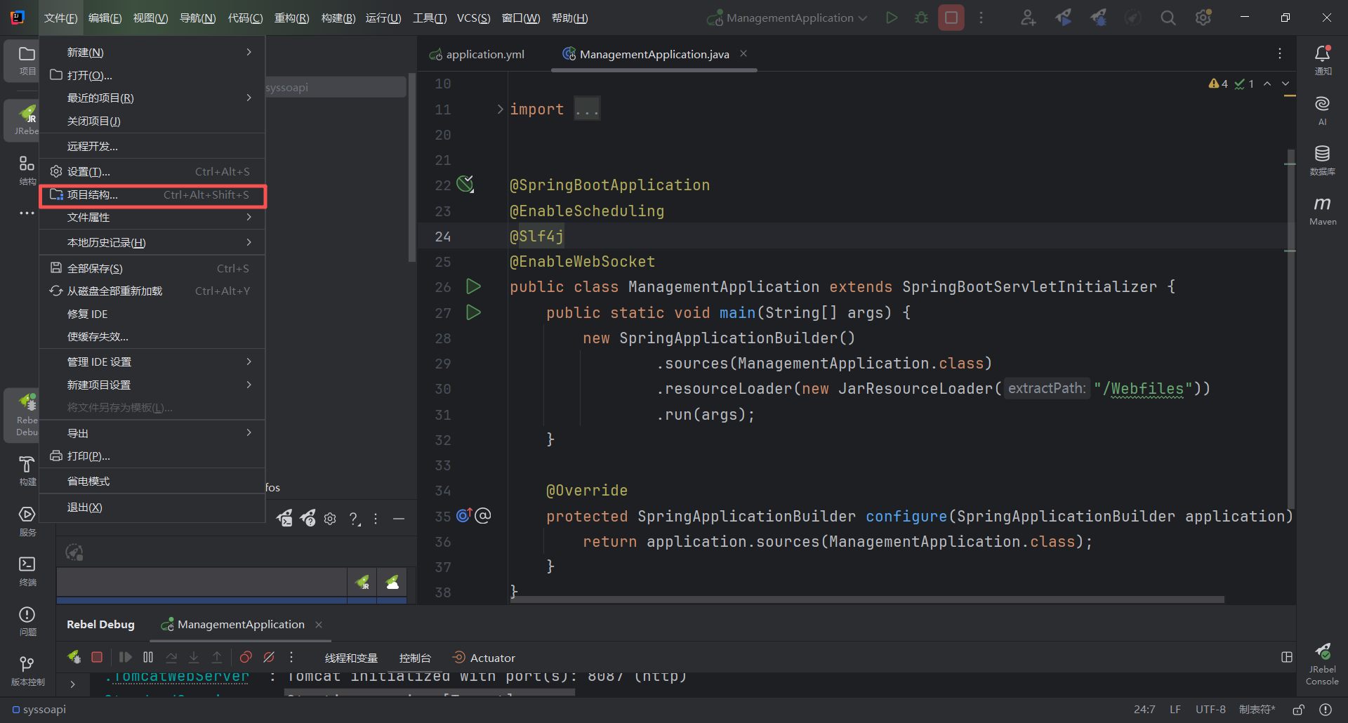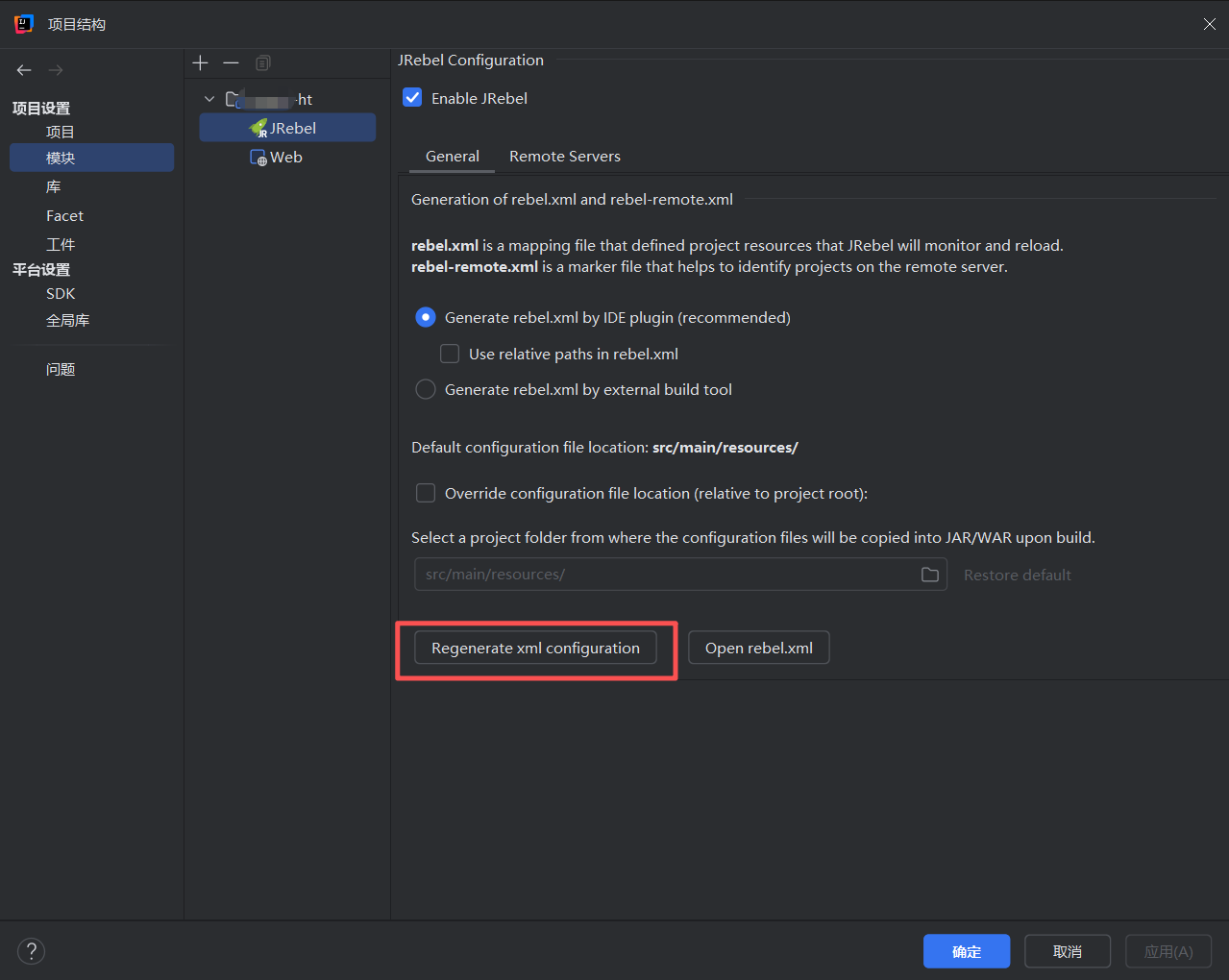 还是在项目结构里,选择【模块】里的【JRebel】,点击下发生成xml配置文件。