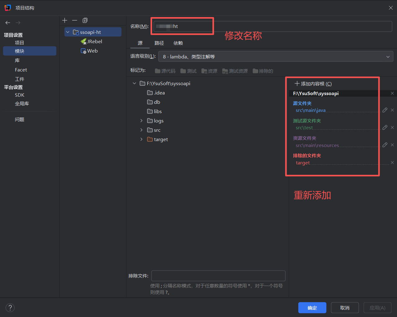 打开【项目结构】,修改项目名称,重新配置路径。确定保存。