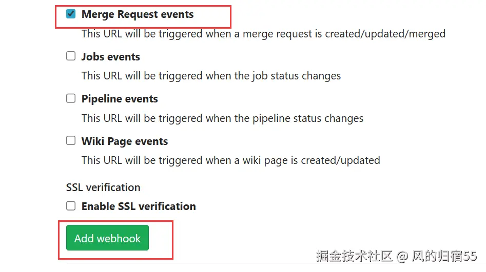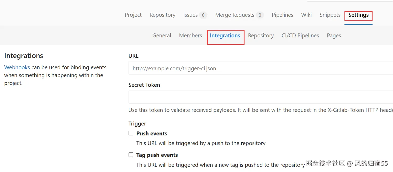 这个在高版本的gitlab中可以直接触发gitlab runner执行 .gitlab-ci.yml中的脚本代码,但是在gitlab 9这个老版本中没有这个功能,于是只能采用麻烦一点的方式,如图所示,可以在settings -> Integrations下,增加一个Merge Requests Events事件的webhook,他会在有mr事件时触发回调自定义服务器的接口。这里我也贴一下mr事件回调的数据格式。