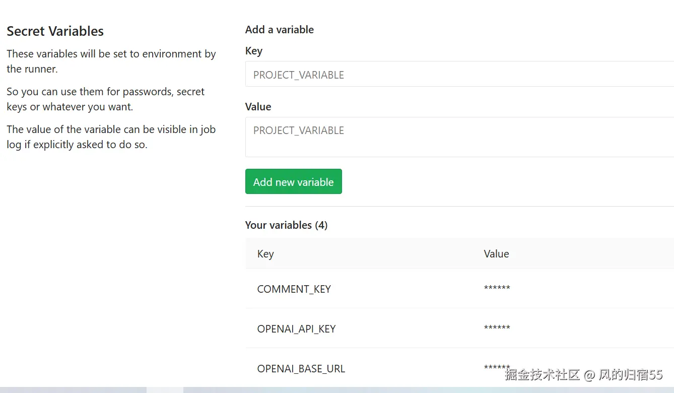 因为qwen调用需要三个参数,其中包括秘钥信息,这里可以通过gitlab的 settings -> CI/CD Pipelines下面的Secret Variables功能来实现,通过Add new variable添加变量OPENAI_API_KEY,OPENAI_BASE_URL,OPENAI_MODEL,这样.gitlab-ci.yml脚本中启动镜像时会自动注入这些变量作为环境变量,就可以直接执行qwen命令调用ai。