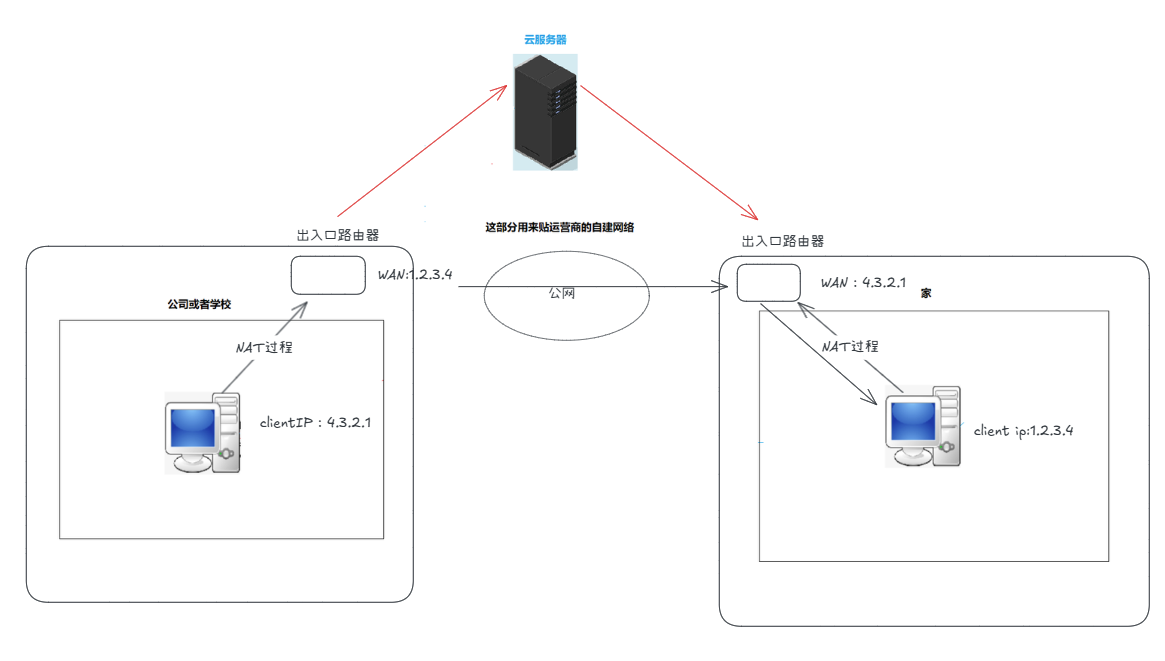 经过NAT技术,云服务器拿到的client ip是客户端的出入口路由器的WAN口IP,并且路由器记录了NAT路由,可以直接通过ip+port访问对方而不经过云服务器,这就是p2p。内网打洞和内网穿透,原理上是一样的。
