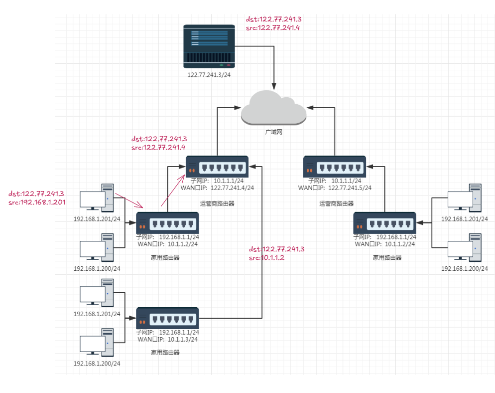 NAT的过程简单来说就是IP地址的转换。例如一个局域网内要向外发送一个报文:查到dst不是本局域网内的IP,通过默认设置转发到路由器,此时将源IP改为当前局域网路由器的公网IP,以此类推。