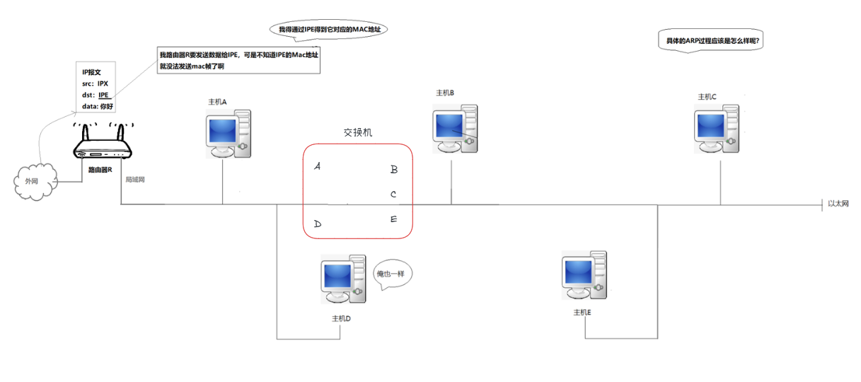 路由器如果不知道MAC地址,是无法进行以太网帧封装从而进行内网转发的,但我们知道,路由器大概是可以知道接收端的IP地址的。我们需要一种局域网协议实现IP地址和MAC地址的映射------ARP协议。