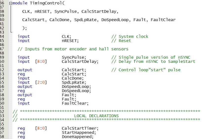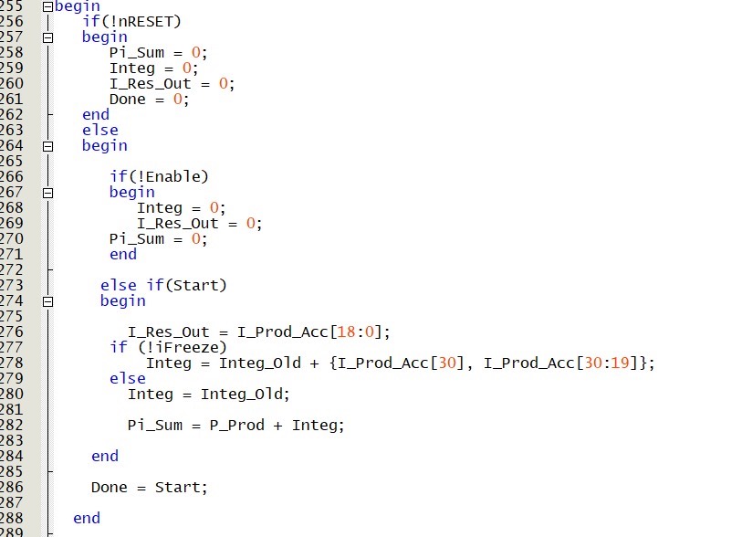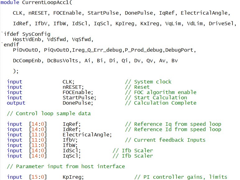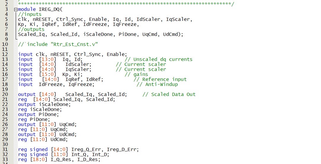 在这段代码中,currentloop**模块接收时钟信号clk、复位信号rst、电流参考值current ref和电流反馈值currentfb*。通过计算两者的差值error,然后基于简单的比例控制算法(实际应用中多采用PI控制),得到输出电压voltage* out,以此来调整电机的电流。