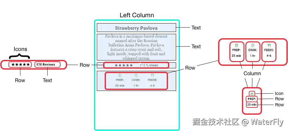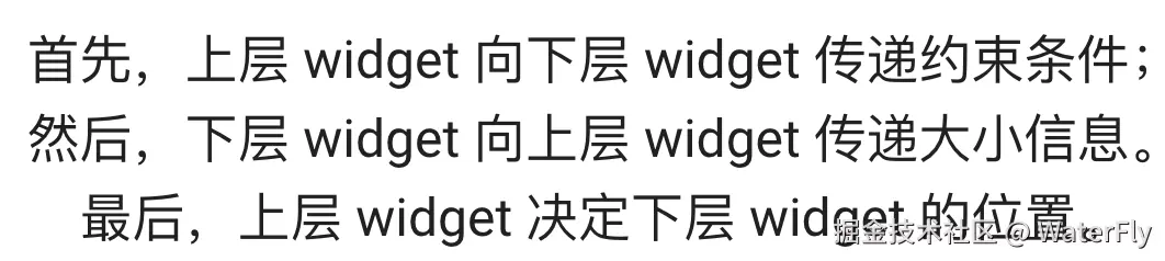 子组件确定尺寸,子组件在约束范围内计算自身尺寸,并向上返回结果(如 Text 根据文字内容计算大小)。