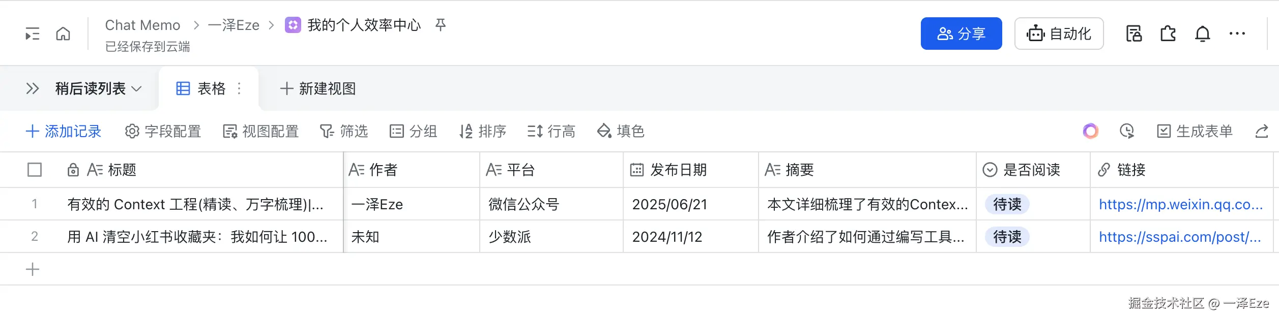在这份飞书多维表格,根据稍后读的管理需要,表的字段如下: