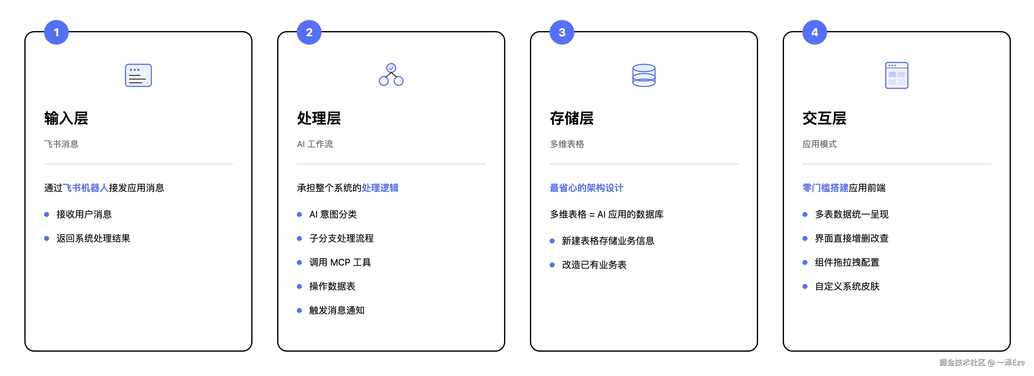 先说整体架构,这这套系统之所以能零代码实现,是因为它把复杂的软件架构,简化成了飞书里的 4 个模块: