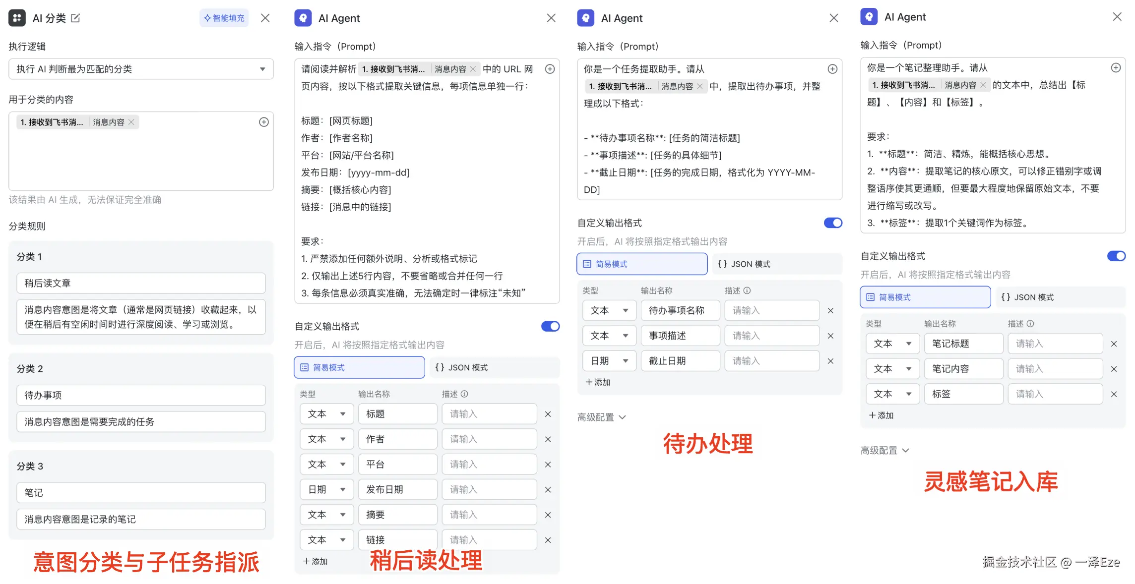 在本文 Case 中,待办、笔记、稍后读,分属于不同表,通过 AI 分类节点,自动判断用户输入的入库位置