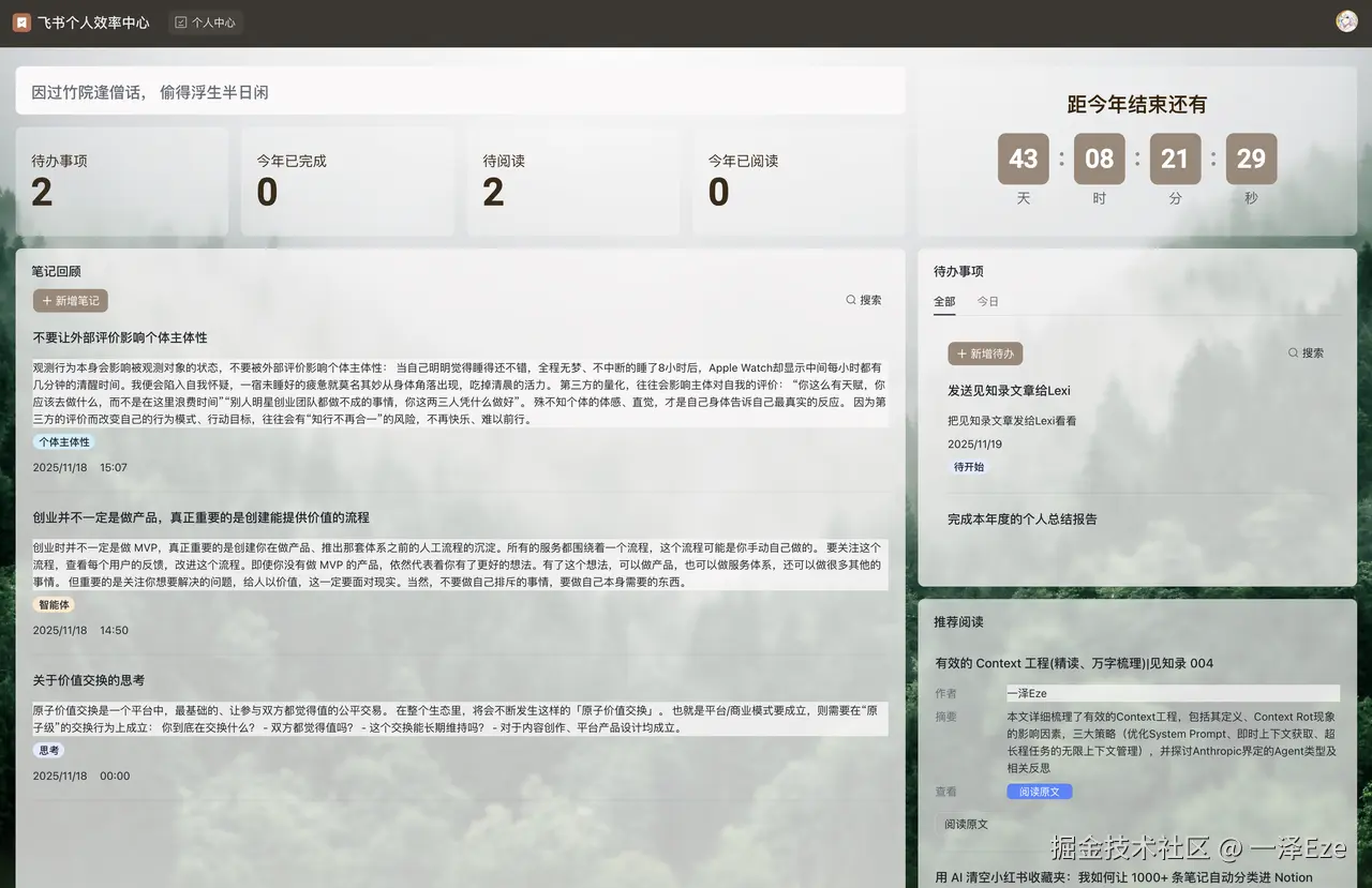 起因是飞书多维表格全面上线了新功能,「应用模式」和「AI 工作流」。我尝试用它零代码搭了一套个人效率工作台,效果意外得好。
