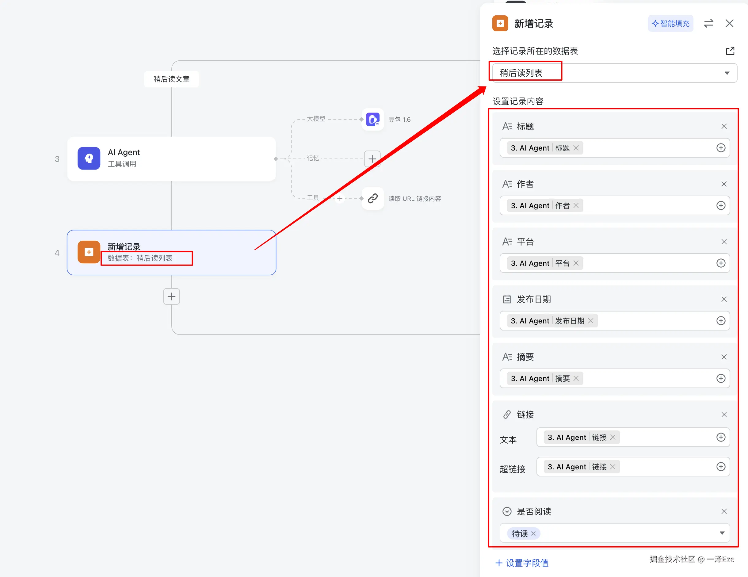 这一步的目的,就是把之前 Agent 获取到的信息,添加到我们的稍后读多维表格中。