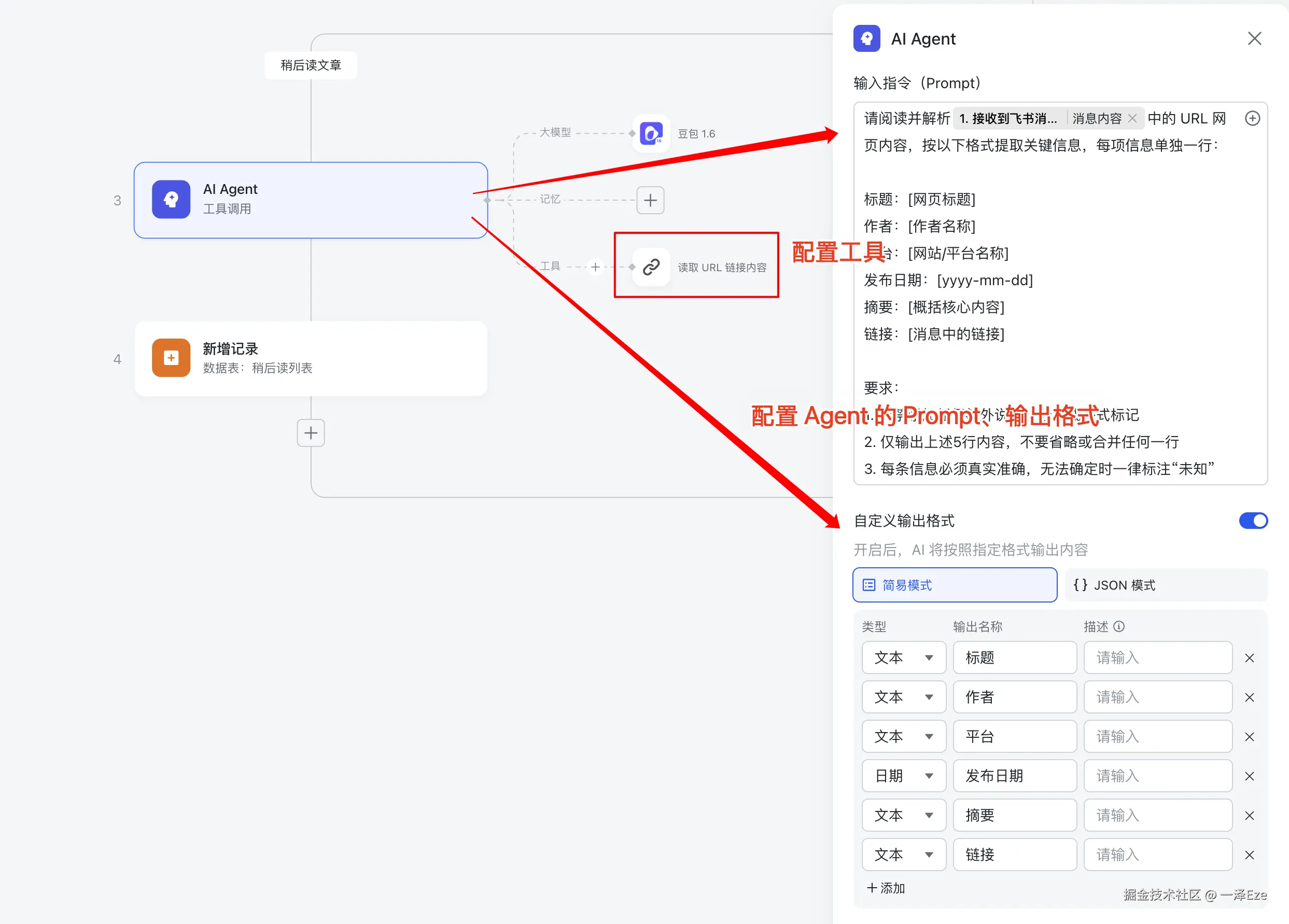 这里,以我"稍后读文章"的收集为例,进行详细说明,方便你理解如何在工作流中,配置 Agent 节点。