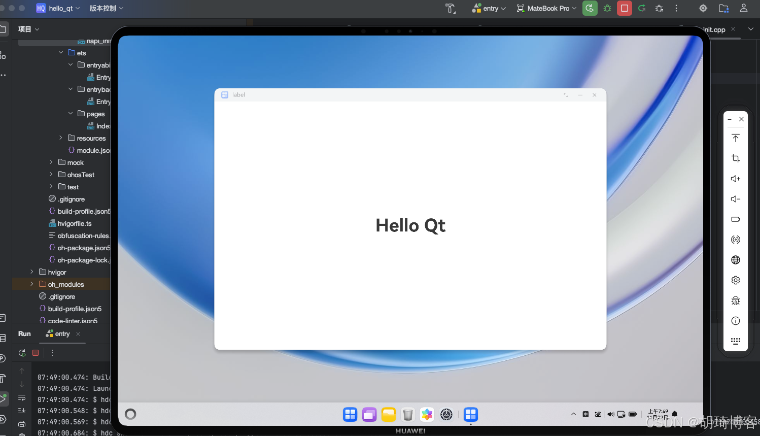 接着我们参考文档 https://gitcode.com/qtforohos/UserManual/blob/main/HarmonyOS设备运行及调试配置.md ,最终在 DevEcho 中运行了第一个 Qt 程序:
