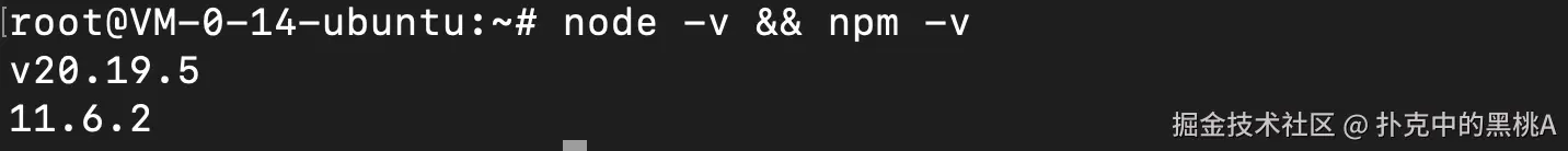 node -v && npm -v- 目的 :验证 Node.js 和 npm 是否安装成功,并显示它们的版本号,确保