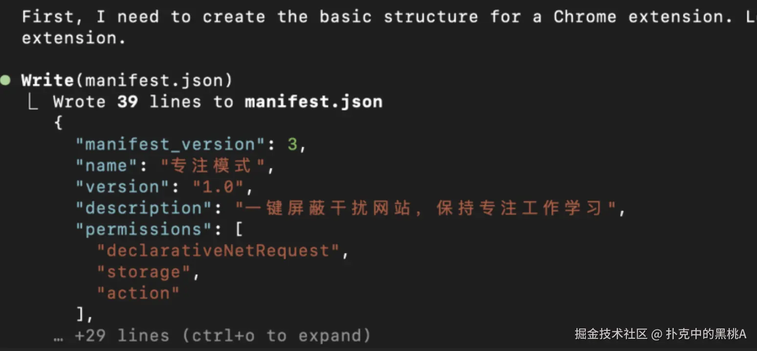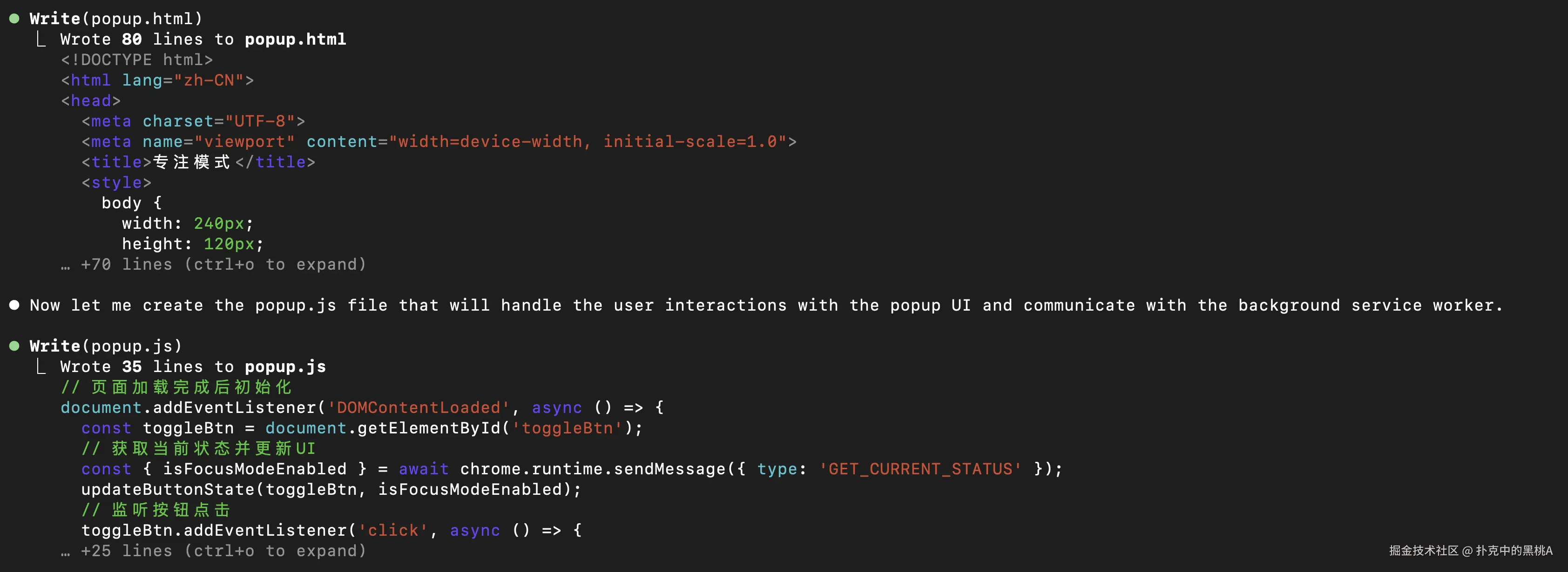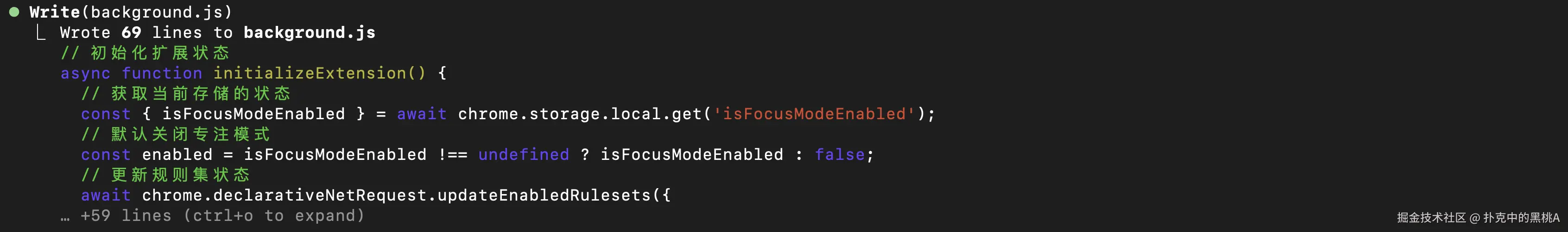 当我把一份专业的 PRD 文档(claude.md)交给 Doubao-Seed-Code 时,它不仅"读懂"了需求,还迅速提供了基于 Manifest V3 的完整技术架构。从 popup.js 的前端交互逻辑,到 background.js 的消息传递,再到 declarativeNetRequest 的核心屏蔽规则,它生成的代码精准且高效。