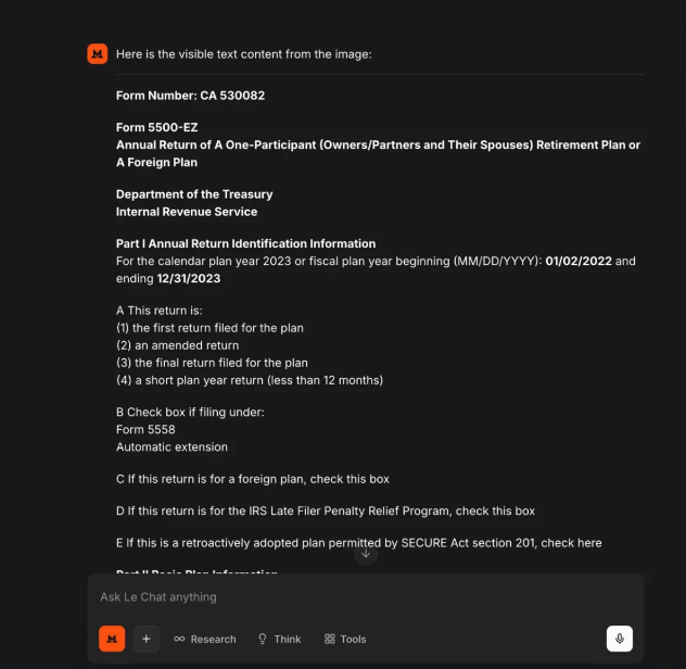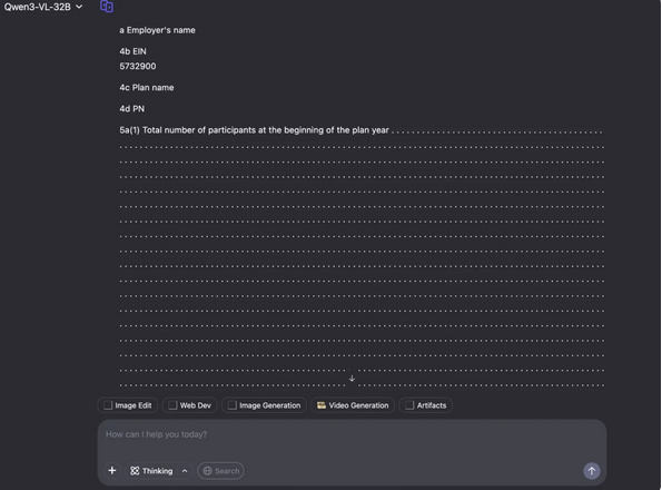 - 同步上传与前两款模型测试一致的、经标准化预处理后的 IRS 5500-EZ 表格图像,及统一制定的 OCR 测试提示;