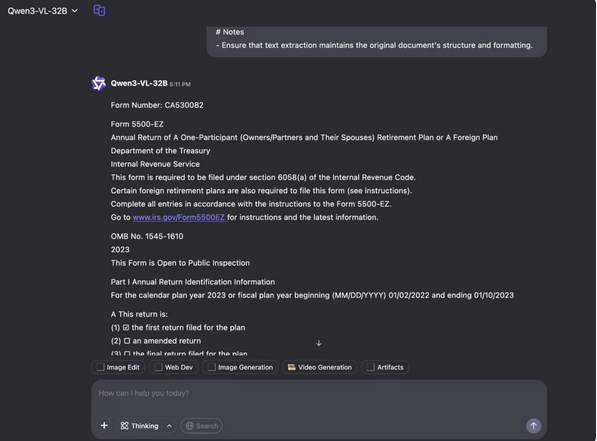 然而,Qwen-3 VL 存在显著的响应效率短板:在处理 IRS 5500-EZ 表格的过程中,系统最终触发超时机制,且在提取任务后期持续出现无限点状加载的异常状态,导致无法输出完整识别结果。这种关键场景下的速度故障,直接限制了其在大规模AI文档处理管道中的应用可行性------对于企业级批量处理场景而言,高精度的识别结果必须依托低延迟、高稳定的交付能力才能体现实际价值,单纯的技术精度无法弥补效率层面的核心缺陷。