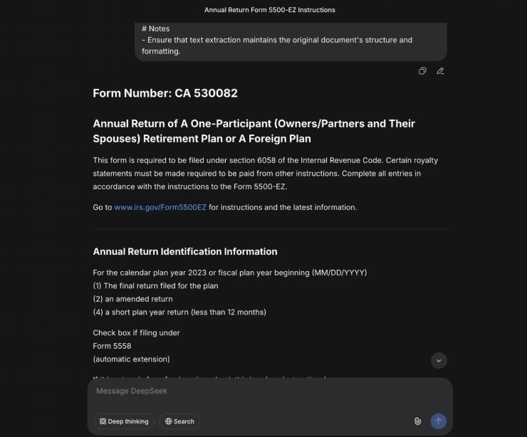 - 按照平台交互流程,同步上传与DeepSeek OCR测试一致的、经标准化预处理后的IRS 5500-EZ表格图像,及统一制定的OCR测试提示;