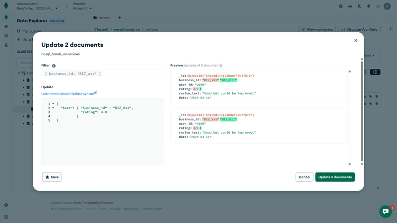 db.reviews.updateOne(