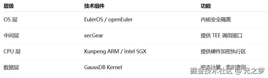 openGauss 的全密态能力与 secGear + Kunpeng + EulerOS 深度集成,形成"软硬一体化可信执行环境":