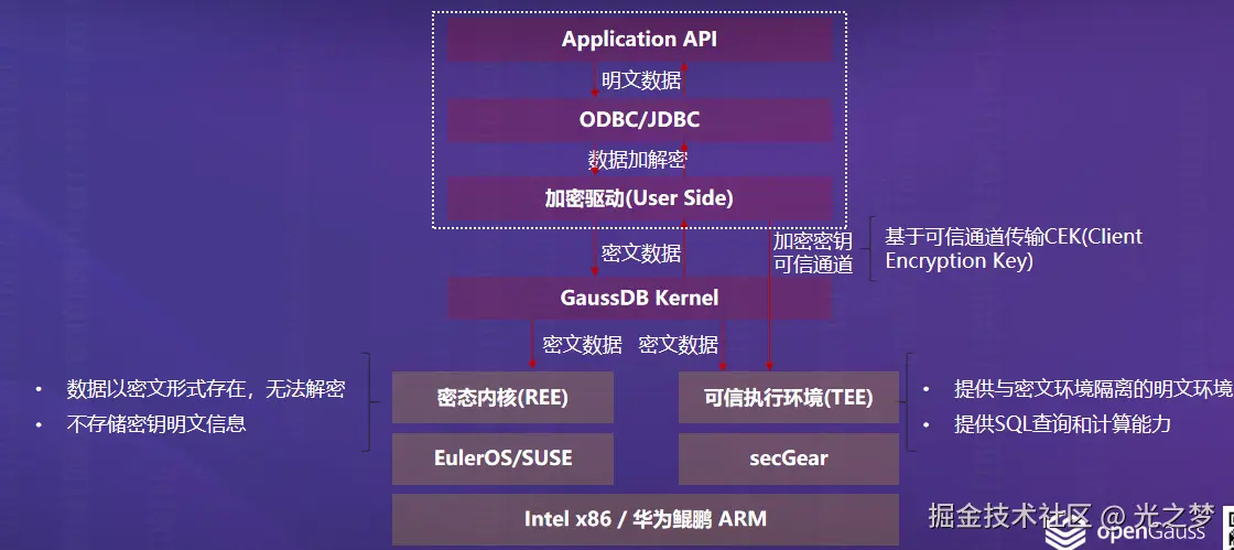 该图展示了 openGauss 在加密驱动层、数据库内核层、可信执行环境三层结构下的数据流动路径: