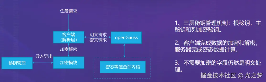 由客户端生成并通过可信通道传输给数据库内核;列加密密钥(Column Encryption Key, CEK) 绑定特定列或字段,实现细粒度数据加密。