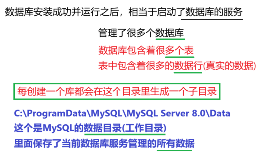 数据库 创建成功 后,会在数据目录下生成一个与数据库同名 的目录, 用于保存数据库 中所有的数据。