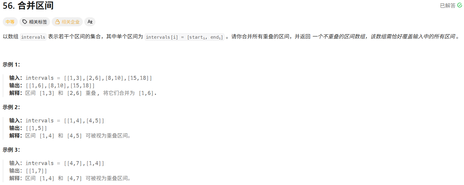 合并区间是区间间取并集,最终返回所有的并集。按照左端点升序排序,不断更新右端点最大值,直到无法更新,则开新区间。
