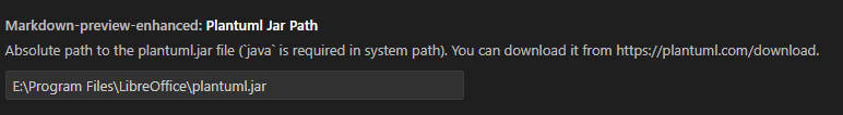 - 在Markdown Preview Enhanced设置项【Markdown-preview-enhanced: Plantuml Jar Path】中配置plantuml.jar所在的本地路径。