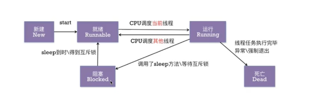 线程五大状态:创建 → 就绪 → 运行 → 阻塞 → 终止