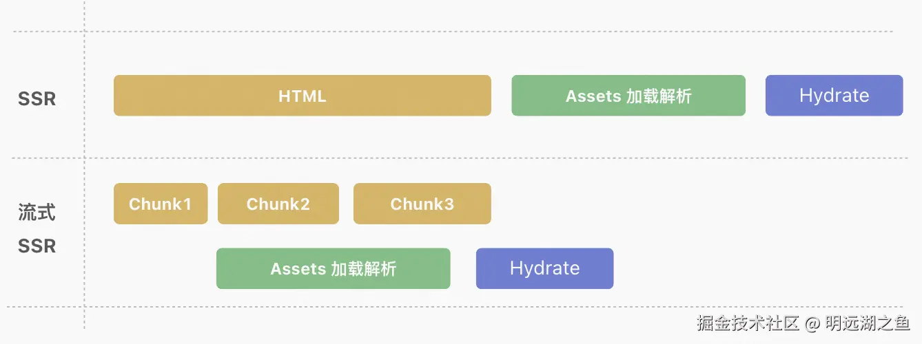 在流式 SSR 中,服务端会根据客户端的请求,逐步生成页面内容,并将它们作为流式数据流式传输到客户端。客户端可以在接收到一部分数据后,就开始逐步显示页面,而不需要等待整个页面渲染完成。这种方式可以有效提高页面的加载速度和用户体验。