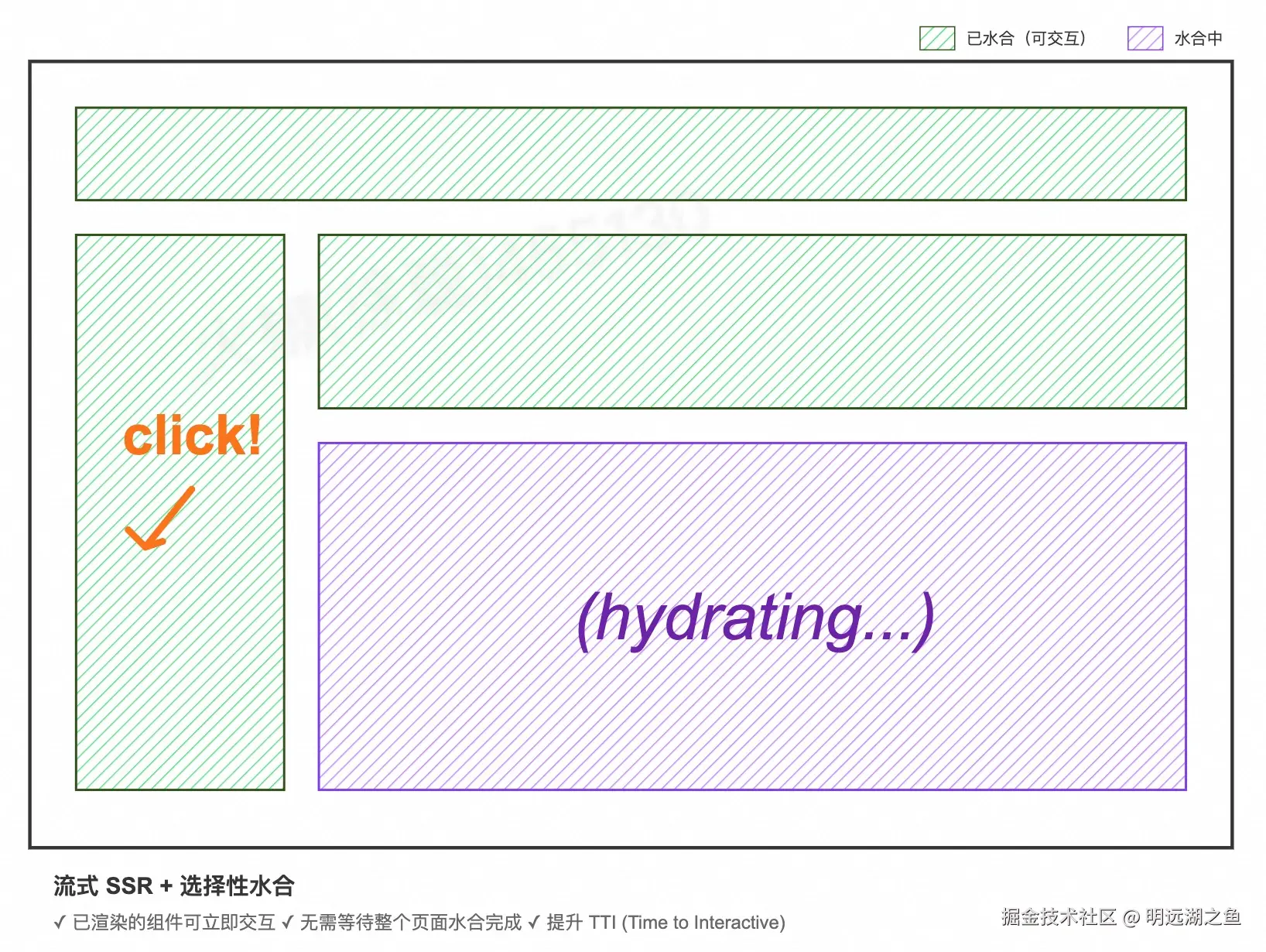 在 SSR 渲染模式下,将页面节点达到可交互状态的过程称为 Hydrate,它需要在端侧执行 JavaScript。