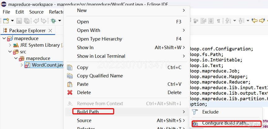 粘贴上述代码后,编辑器会出现很多红色波浪线报错,这是因为没有包含相应的库导致的。右键点击,选择Build Path->configure build path