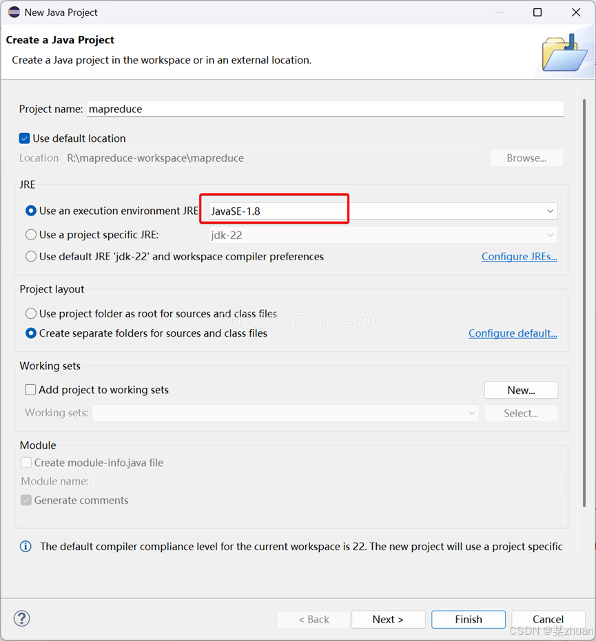 新建java工程,设置java环境,我这里能够设置的最低版本就是java 1.8。工程名字可以自己设置,此处置的名字是mapreduce。其他选项保持默认即可。