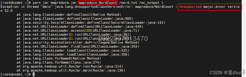 导出Jar使用的Java 1.8,而Hadoop配置的是Java 1.7。可以使用以下命令确认Hadoop的Java版本: