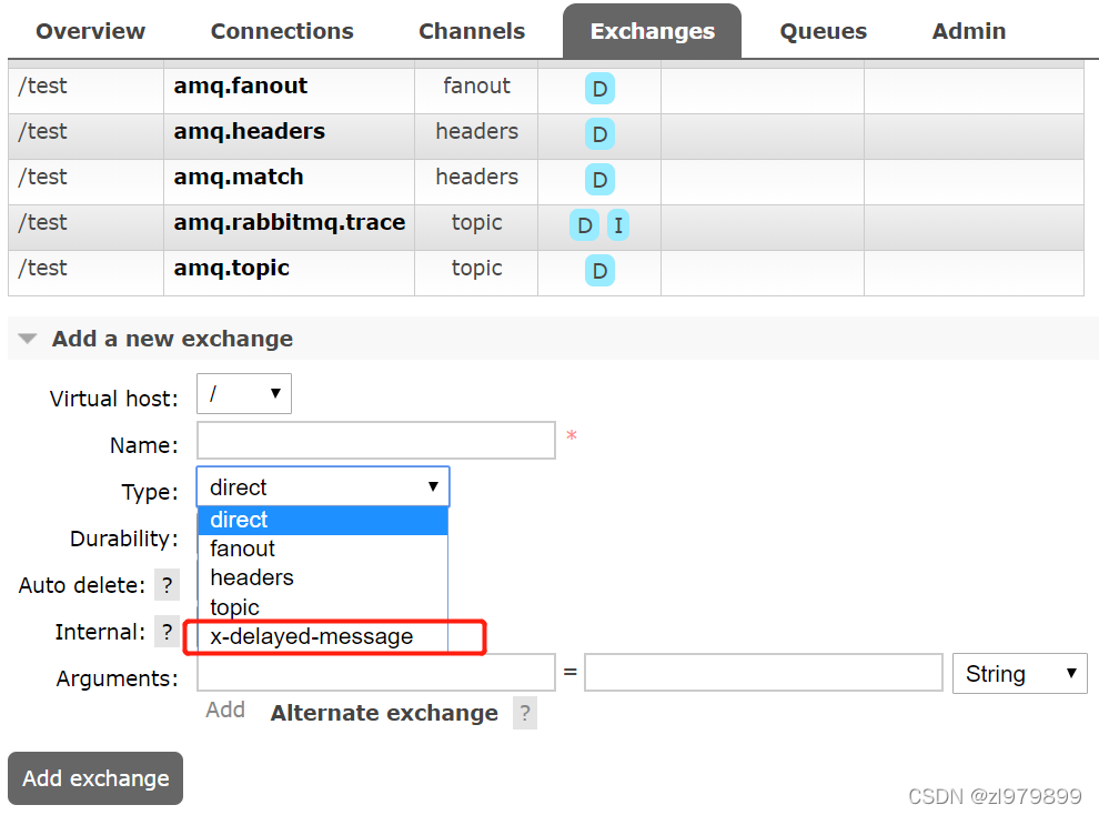 重启mq,查看交换机类型,增加了x-delayed-message