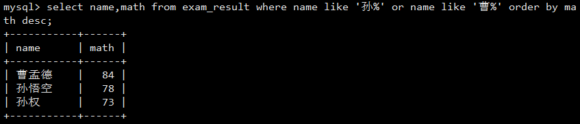 (4) 查询姓孙的同学或者姓曹的同学数学成绩,结果按数学成绩由高到低显示