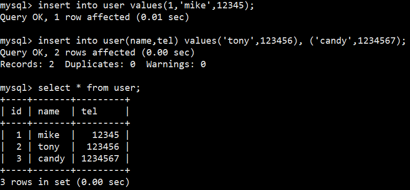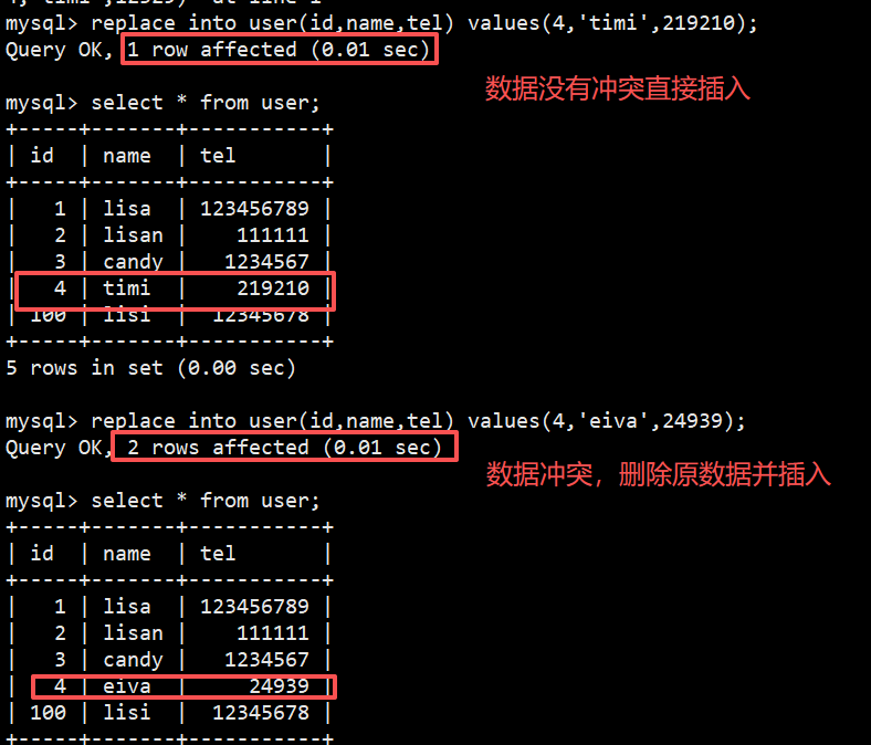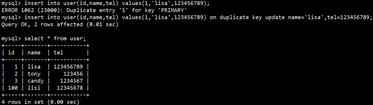 -- 2 row affected: 表中有冲突数据,并且数据已经被更新